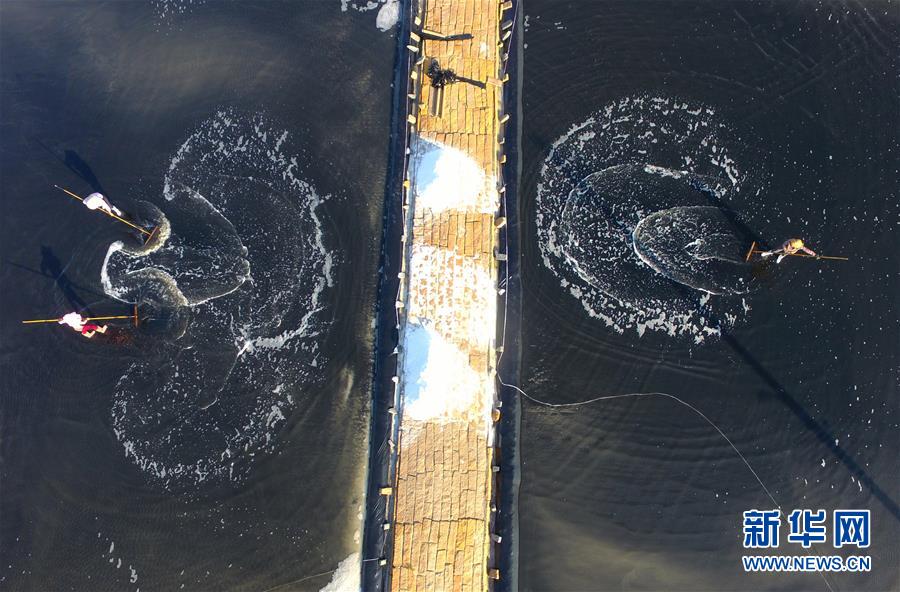 4月27日,莆田鹽場的工人在曬鹽池里忙碌(無人機(jī)照片)。莆田鹽場位于福建省莆田市秀嶼區(qū)東嶠鎮(zhèn),辛勤勞作的鹽工、縱橫交錯的曬鹽池,共同構(gòu)成如畫的風(fēng)景。新華社記者魏培全攝
