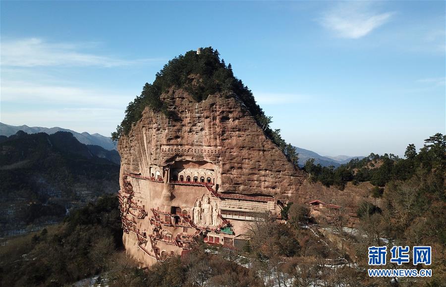 12月26日無(wú)人機(jī)拍攝的雪后晴空下的麥積山石窟。新華社記者馬寧攝