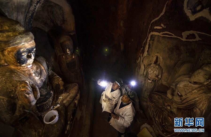 4月27日,文物修復(fù)專家在寧夏須彌山石窟圓光寺48號窟內(nèi)商量修復(fù)方案。新華社記者馮開華攝