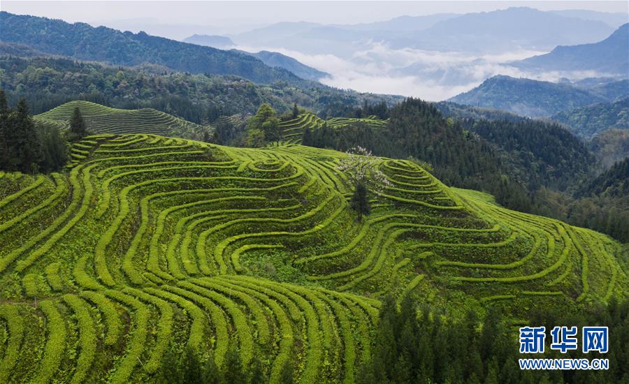 俯瞰鹿鳴茶海一角(4月28日無人機(jī)照片)。四川省珙縣的鹿鳴茶海,常年云霧繚繞,茶壟依山分布,美不勝收。新華社記者江宏景攝