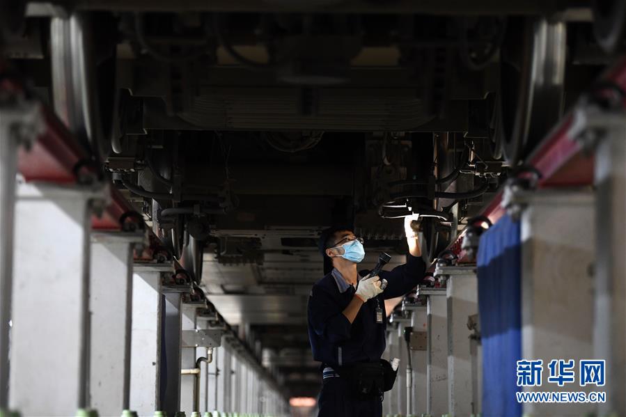 4月29日夜,合肥南動車運(yùn)用所的工作人員對動車組進(jìn)行檢修。每當(dāng)夜深人靜的時候,合肥南動車運(yùn)用所卻燈火通明,“動車安全守護(hù)者”們堅守崗位,對動車組進(jìn)行全面細(xì)致檢修。新華社記者 劉軍喜 攝