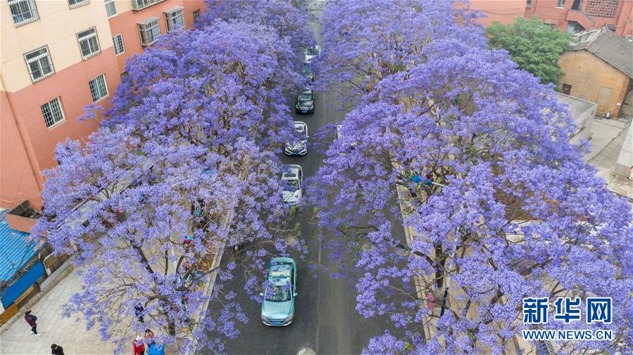 這是5月2日在昆明市教場中路拍攝的藍(lán)花楹(無人機(jī)照片)。近日,云南省昆明市部分街區(qū)的藍(lán)花楹競相開放,為春城增添靚麗風(fēng)景。新華社記者藺以光攝