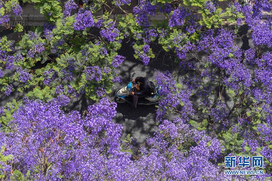 這是5月2日在昆明市教場(chǎng)中路拍攝的藍(lán)花楹。近日,云南省昆明市部分街區(qū)的藍(lán)花楹競(jìng)相開(kāi)放,為春城增添靚麗風(fēng)景。新華社記者藺以光攝