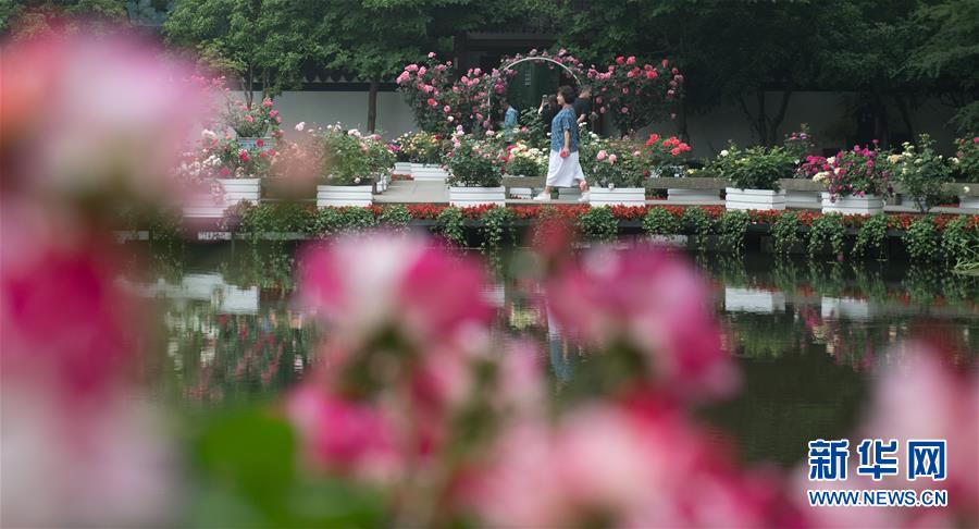 5月5日,游客在西湖畔的郭莊觀看月季花展?!拔逡弧逼陂g,第八屆杭州西湖月季花精品展在杭州西子湖畔舉行,展出國內外700余個月季品種。新華社記者翁忻旸攝