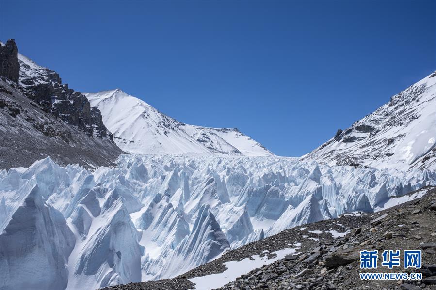 珠峰海拔5800米至海拔6500米的冰塔林(5月9日攝)。從海拔5800米的珠峰過渡營地到海拔6500米的前進營地,冰塔林沿山谷排列,蔚為壯觀。新華社記者孫非攝