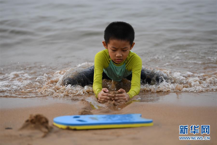 5月10日,小朋友在??谖餍愫┩嫠?。近日,??诔掷m(xù)高溫,不少市民前往海灘戲水消暑。新華社記者蒲曉旭攝