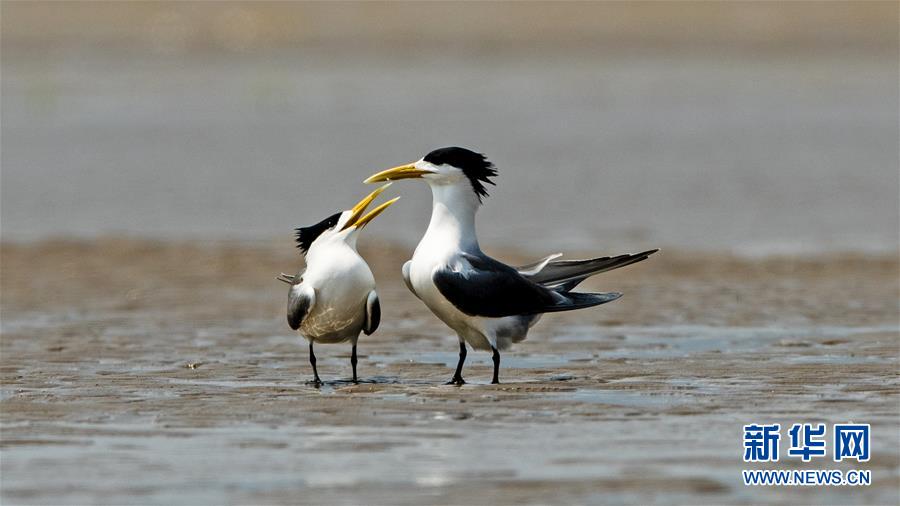 眼下正是大鳳頭燕鷗繁育的時(shí)節(jié),在福建閩江河口濕地核心區(qū)鱔魚灘的沙洲上,大鳳頭燕鷗正相互嬉戲(5月9日攝)。新華社記者梅永存攝