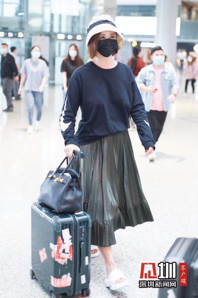 2020年5月14日,上海,張歆藝現(xiàn)身機(jī)場(chǎng)。她頭戴遮陽(yáng)帽,口罩遮面,穿著黑色長(zhǎng)袖T恤搭配百褶長(zhǎng)裙,自提行李箱現(xiàn)身機(jī)場(chǎng),獲粉絲送機(jī),揮手道別。
