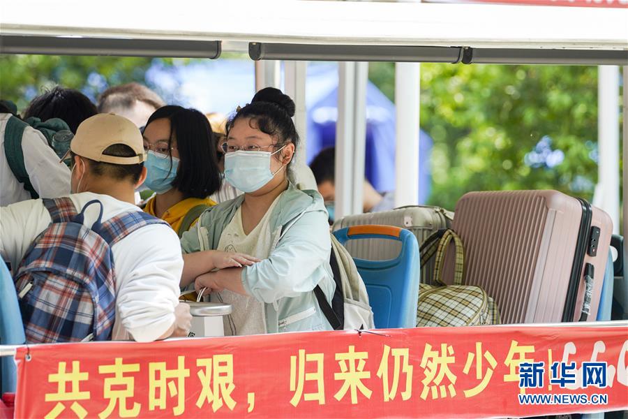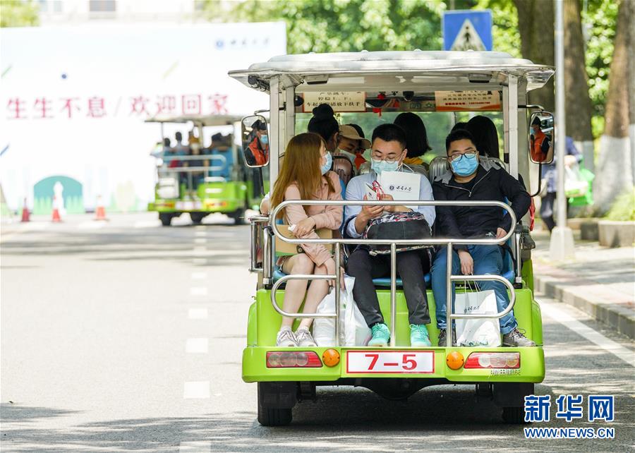 5月15日,在西南大學校園內,學生們搭乘校內轉運車前往各自的宿舍。當日,重慶西南大學迎來疫情以來首批返校大學生。據(jù)介紹,按照疫情防控的需要,重慶市高校2020年春季學期從5月11日起按照“一校一策”原則,實行錯峰錯時分批次有序開學復課。新華社記者劉潺攝