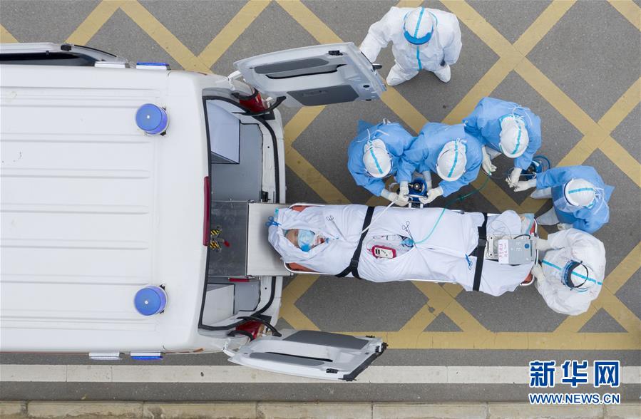 在華中科技大學(xué)附屬同濟(jì)醫(yī)院中法新城院區(qū),醫(yī)護(hù)人員護(hù)送一名剛做完CT檢查的新冠肺炎重癥患者上負(fù)壓救護(hù)車(chē)(3月6日攝,無(wú)人機(jī)照片)。新華社記者才揚(yáng)攝