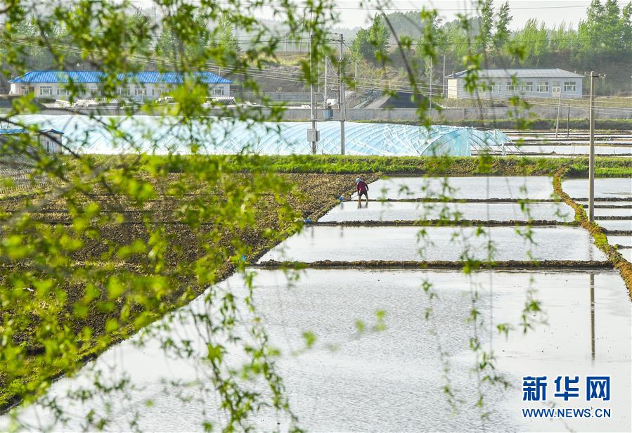 5月17日,在吉林省長春市雙陽區(qū)徐家村,農(nóng)民在水稻田間耕作。新華社記者許暢攝