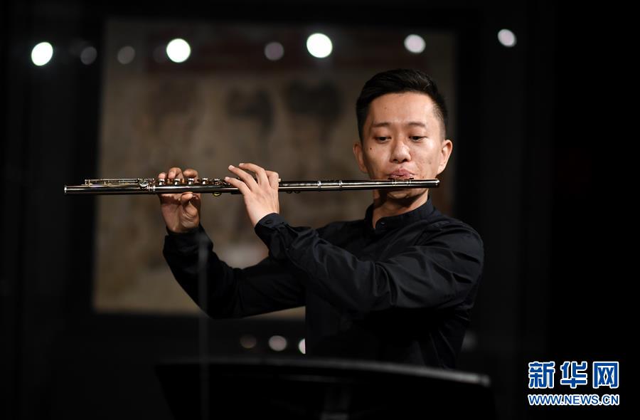 在陜西歷史博物館唐代壁畫(huà)珍品館,西安交響樂(lè)團(tuán)長(zhǎng)笛首席孫丁為“云上國(guó)寶”音樂(lè)會(huì)彩排(5月14日攝)。為迎接國(guó)際博物館日,5月14日,西安交響樂(lè)團(tuán)走進(jìn)陜西歷史博物館唐代壁畫(huà)珍品館,為5月18日的“云上國(guó)寶”音樂(lè)會(huì)彩排。觀眾將通過(guò)網(wǎng)絡(luò)直播,在聆聽(tīng)天籟的同時(shí)欣賞國(guó)之瑰寶,感受藝術(shù)與美的和諧共鳴。新華社記者李一博攝
