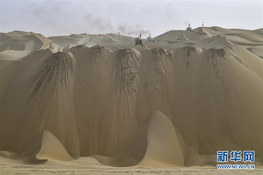 在新疆尉犁至且末沙漠公路施工現場,工人駕駛大型推土機推平沙山(5月17日攝)。新華社記者胡虎虎攝