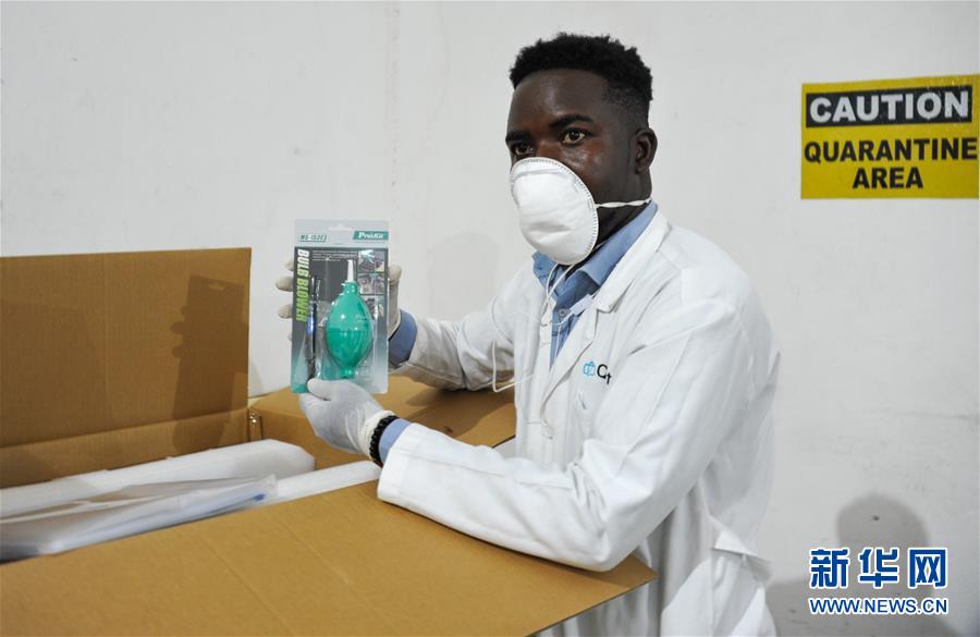 在加納首都阿克拉,加納最大的連鎖藥品供應(yīng)商mPharma的工作人員整理從中國湖南圣湘生物科技股份有限公司進(jìn)口的檢測設(shè)備(2020年5月6日攝)。新華社記者許正攝
