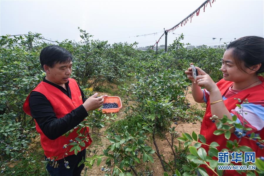 5月20日,長(zhǎng)興縣林城鎮(zhèn)上獅村的藍(lán)莓種植幫扶基地內(nèi),青年志愿者與種植戶通過手機(jī)直播藍(lán)莓的采摘,并介紹當(dāng)?shù)厮{(lán)莓生長(zhǎng)環(huán)境和品質(zhì),進(jìn)行網(wǎng)上銷售。新華社記者徐昱攝