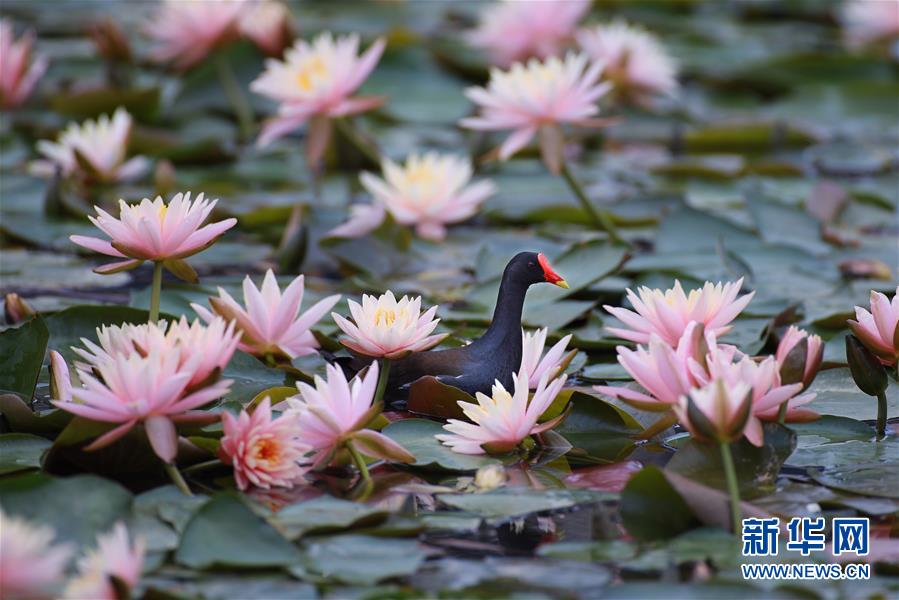 5月22日,一只紅嘴水雞在蓮葉間游弋。近日,貴陽市觀山湖公園內(nèi)大片盛開的蓮花吸引了不少水鳥在其間嬉戲覓食。新華社記者劉續(xù)攝