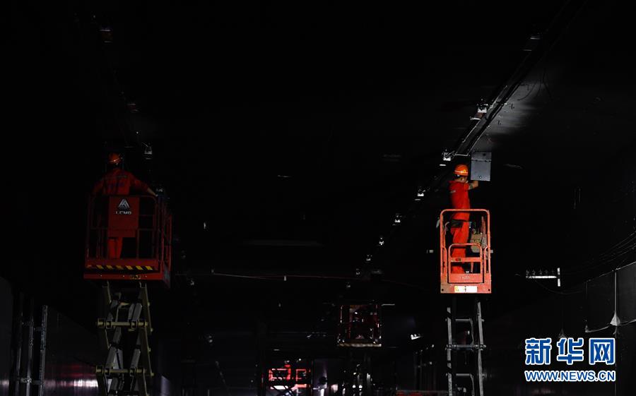 5月23日,工人在??谖拿鳀|越江通道項目隧道內(nèi)安裝照明設(shè)備。新華社記者楊冠宇攝