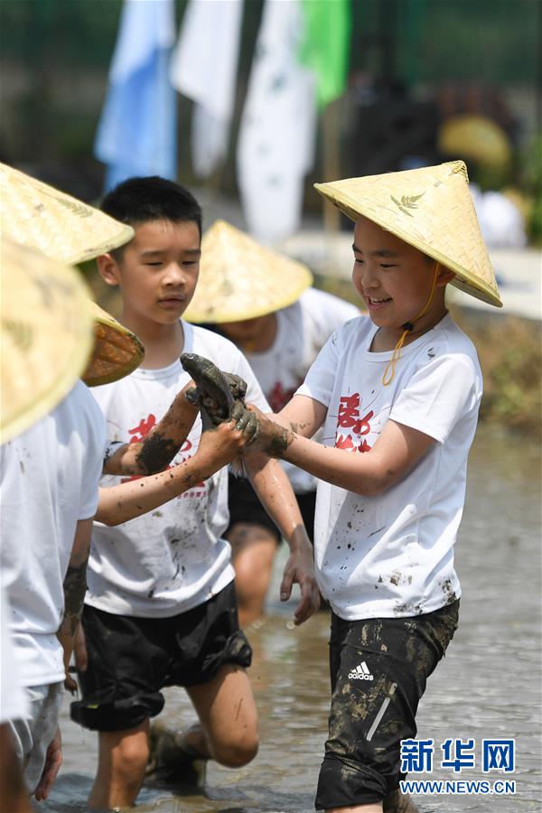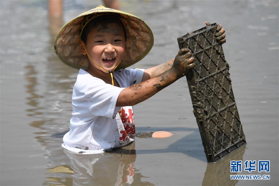 5月24日,小朋友在稻田里捉魚,體驗農(nóng)事。當日,十余名小朋友在家長的帶領下來到浙江省湖州市吳興區(qū)八里店鎮(zhèn)尹家圩糧油植保農(nóng)機專業(yè)合作社的稻田中,參加親子插秧、稻田捉魚等農(nóng)事體驗活動。新華社記者黃宗治攝
