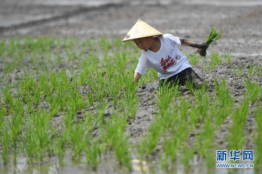 5月24日,一名小朋友在稻田里插秧。當日,十余名小朋友在家長的帶領下來到浙江省湖州市吳興區(qū)八里店鎮(zhèn)尹家圩糧油植保農(nóng)機專業(yè)合作社的稻田中,參加親子插秧、稻田捉魚等農(nóng)事體驗活動。新華社記者黃宗治攝