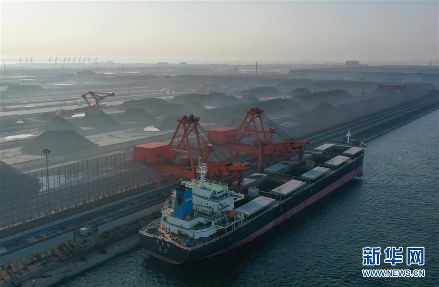 5月22日,一艘輪船靠泊在唐山港曹妃甸港區(qū)煤碼頭三期工程的先期工程泊位裝貨(無人機(jī)照片)。新華社記者楊世堯攝