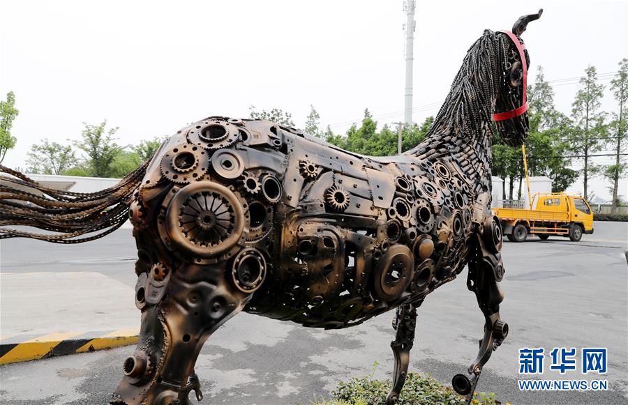 利用廢舊汽車零部件制作的馬造型工藝品擺在中轉服務站內(5月27日攝)。新華社記者方喆攝