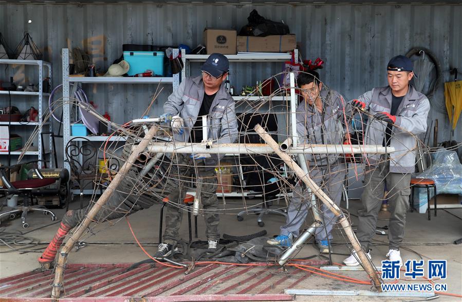 5月27日,制作團隊成員李剛在中轉服務站工棚內,用廢舊鋼絲制作牛造型工藝品的身體部分。新華社記者方喆攝