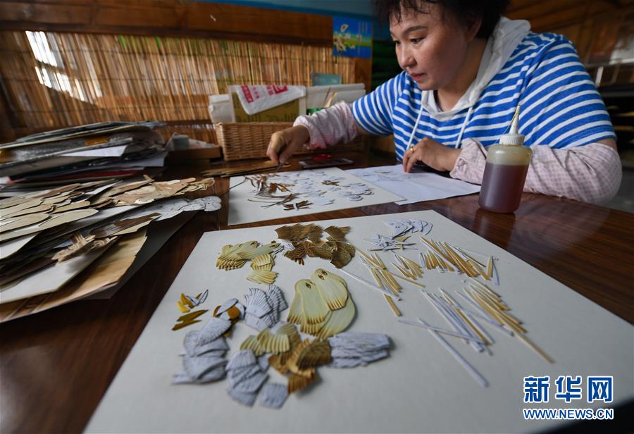 5月19日,在新疆博湖縣,手工藝人根據(jù)分解圖將經(jīng)過裁剪、燙色的蘆葦粘貼成完整的圖案。新華社記者宋彥樺攝