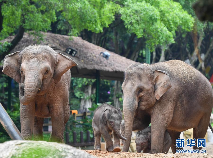 5月27日,廣州長(zhǎng)隆的兩只新生亞洲象寶寶在媽媽的陪伴下玩耍。新華社記者劉大偉攝