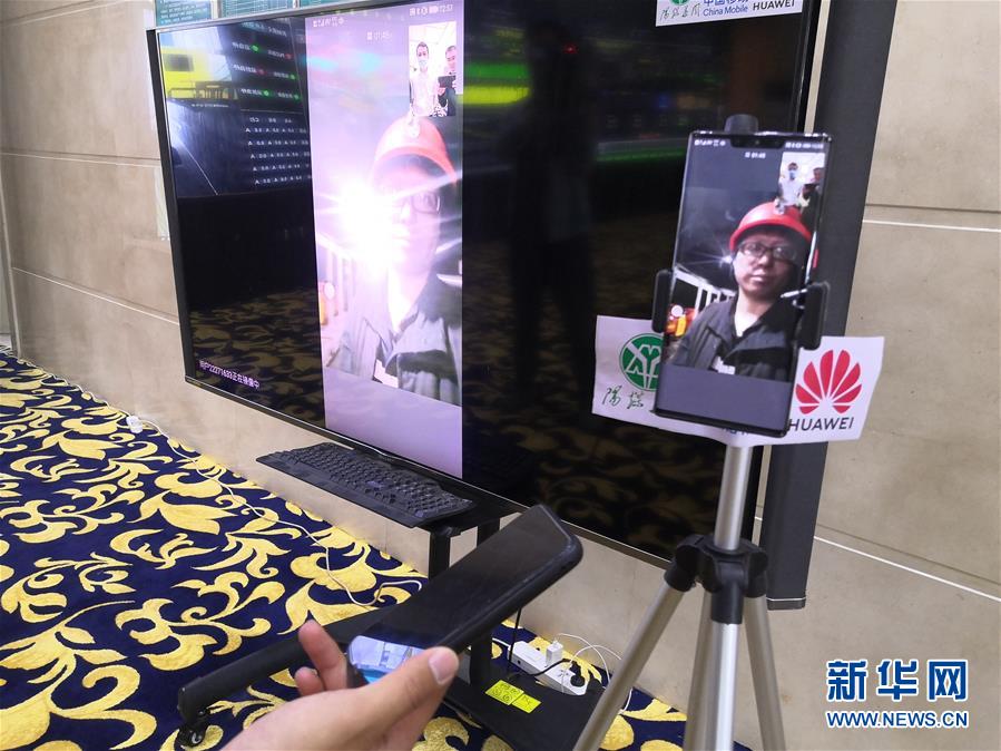 在山西陽(yáng)煤集團(tuán)新元煤礦調(diào)度中心,記者通過(guò)5G網(wǎng)絡(luò)視頻采訪(fǎng)井下礦工(5月27日手機(jī)拍攝)。新華社記者梁曉飛攝