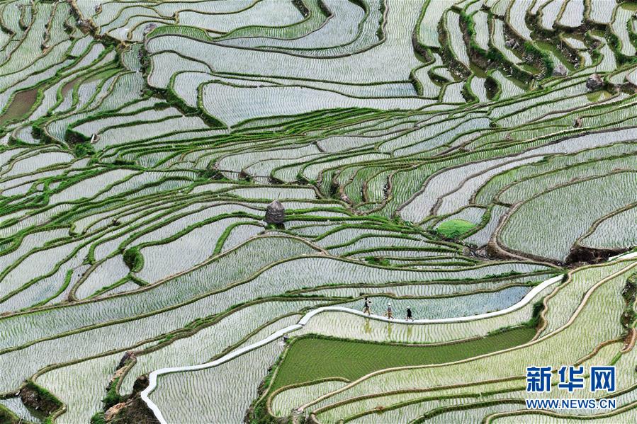 村民從從江縣加榜鄉(xiāng)黨扭梯田上經(jīng)過(5月26日攝)。夏日時(shí)節(jié),位于貴州省黔東南苗族侗族自治州從江縣加榜鄉(xiāng)加車、加頁、黨扭等苗寨的梯田在晨霧與陽光的映襯下線條分明,光影變幻,景色如畫。新華社記者 楊文斌 攝