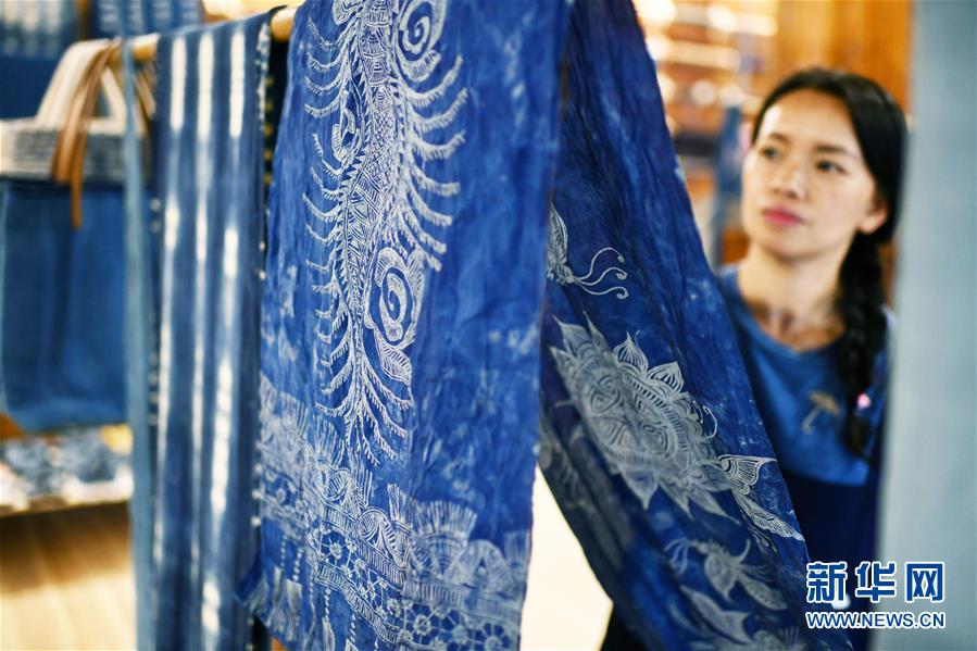 2018年,楊成蘭在村里成立傳統(tǒng)織染合作社,吸引村里及周邊村寨貧困戶入股,帶動當?shù)刎毨艉痛迕窦尤牒献魃?,從事織布、染布、藍靛種植等產(chǎn)業(yè),在傳承民族傳統(tǒng)手工技藝的同時,幫助村民脫貧增收。新華社記者楊文斌攝