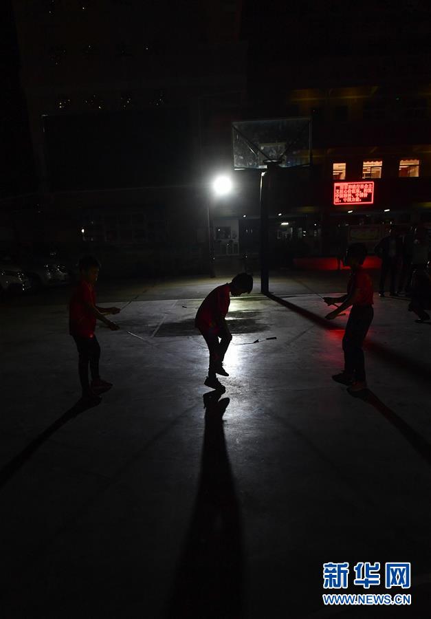 鐘煒?shù)h在校園小廣場(chǎng)上和同學(xué)練跳繩,當(dāng)天晚上,電影《點(diǎn)點(diǎn)星光》將在七星小學(xué)操場(chǎng)上舉行首映式(2019年11月15日攝)。新華社記者劉大偉攝