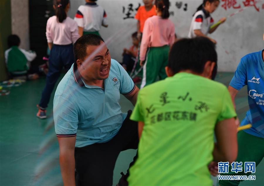 七星小學(xué)跳繩隊(duì)教練賴宣治(左)正大吼著激勵(lì)隊(duì)員訓(xùn)練。正是這位沒(méi)有接觸過(guò)專(zhuān)業(yè)跳繩訓(xùn)練的的體育老師把跳繩運(yùn)動(dòng)引入學(xué)校,十年不懈,領(lǐng)著孩子們從鄉(xiāng)村的小操場(chǎng)跳到世界的大舞臺(tái)(2019年11月18日攝)。新華社記者劉大偉攝