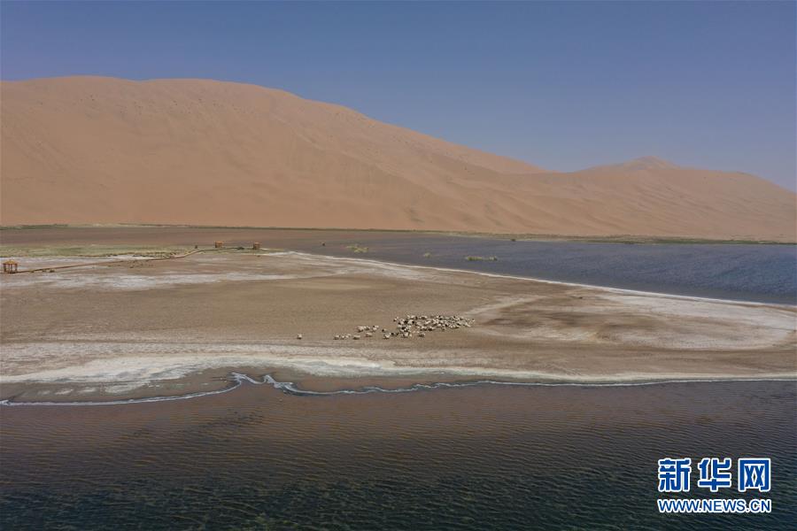 5月30日,羊群在巴丹吉林沙漠一處沙漠湖泊的湖畔休憩(無人機(jī)照片)。新華社記者徐欽攝。