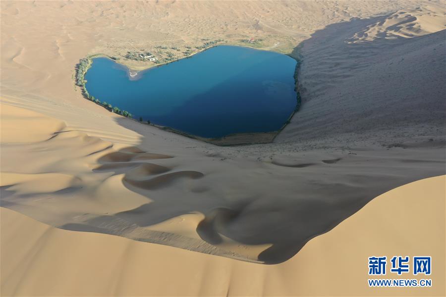 這是5月30日拍攝的巴丹吉林沙漠一處湖泊(無人機(jī)照片)。新華社記者徐欽攝。