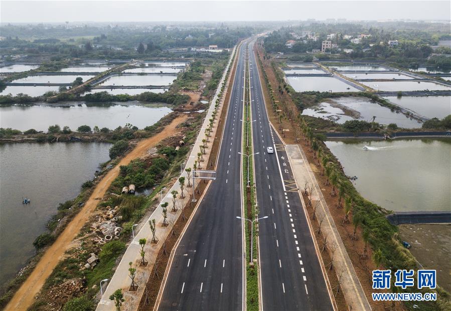 這是4月1日拍攝的位于??诮瓥|新區(qū)的東寨港大道(無人機照片)。新華社記者蒲曉旭攝