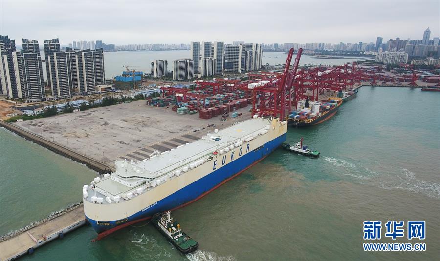 滾裝貨船“勞拉”輪駛?cè)牒?谛阌⒏?,這是海南自貿(mào)區(qū)政策實(shí)施以來(lái)的首艘汽車外貿(mào)船(2月16日攝,無(wú)人機(jī)照片)。新華社記者楊冠宇攝