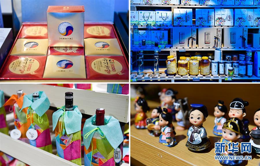 在延邊朝鮮族自治州和龍市“金達萊絲路”電商平臺實體店內(nèi)拍攝的帶有朝鮮族元素包裝的農(nóng)特產(chǎn)品及文創(chuàng)產(chǎn)品(拼版照片,5月7日攝)。新華社記者許暢攝。