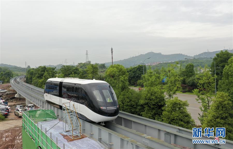 6月3日,一臺(tái)“云巴”在專用運(yùn)行軌道上進(jìn)行調(diào)試(無人機(jī)照片)。近日,重慶市首條“云巴”示范線項(xiàng)目在重慶璧山區(qū)正式亮相。此次發(fā)布的“云巴”采用電能驅(qū)動(dòng),具有轉(zhuǎn)彎半徑小、爬坡能力強(qiáng)、噪音低、安全性高、建設(shè)成本低、建造周期短等優(yōu)勢,能為乘客提供更智能、舒適、便捷的出行體驗(yàn)。據(jù)介紹,璧山區(qū)“云巴”示范線項(xiàng)目自2019年8月開建,線路正線全長15.4km,共設(shè)車站15座,預(yù)計(jì)2020年9月全線通車。新華社記者劉潺攝。
