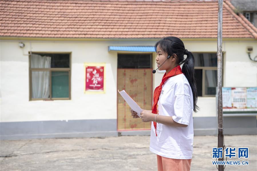 6月2日,秦春蘭在學(xué)校的升旗儀式上發(fā)言。新華社記者楊晨光攝。