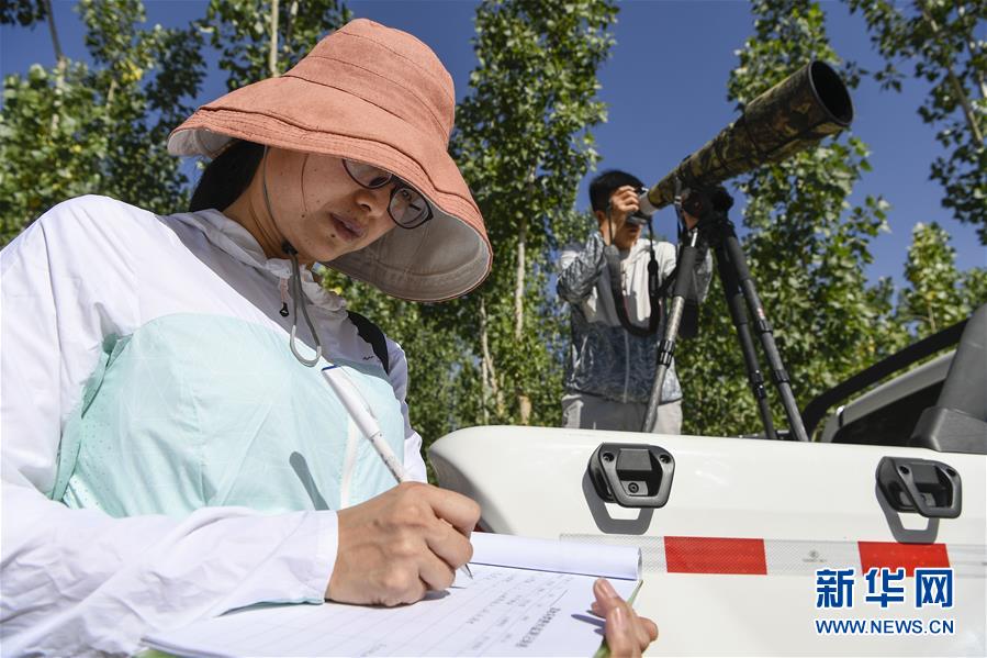 6月3日,李學(xué)明的同事張海榮(左)在填寫濕地鳥類野外監(jiān)測記錄表。新華社記者馮開華攝。