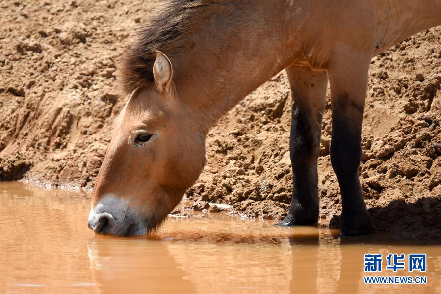 在新疆卡拉麥里山有蹄類野生動(dòng)物自然保護(hù)區(qū),一匹普氏野馬在水源地飲水(6月3日攝)。新華社記者丁磊攝。