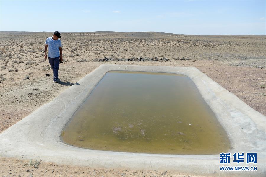 在新疆卡拉麥里山有蹄類野生動物自然保護(hù)區(qū),管護(hù)員阿達(dá)比亞特來到人工建設(shè)的水池查看蓄水情況(6月3日攝)。新華社記者丁磊攝。