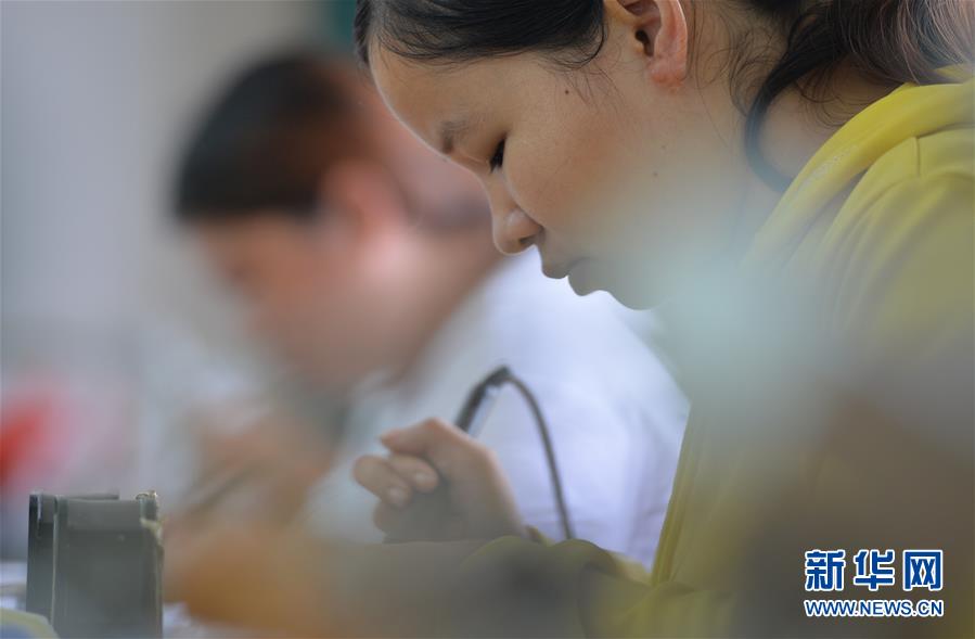 6月4日,一名女工在永州市新田縣一處易地搬遷集中安置點(diǎn)的扶貧車間里加工電器零部件。新華社記者趙眾志攝。