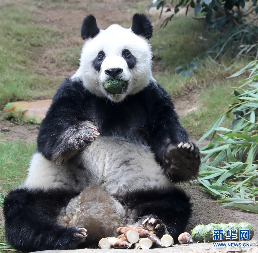 在香港海洋公園,大熊貓“安安”坐在小山坡上吃竹葉團(tuán)(5月11日攝)。新華社記者吳曉初攝