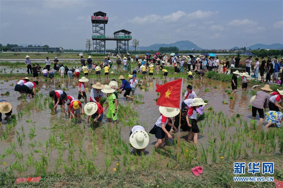 6月7日,孩子和家長們在體驗稻田插秧(無人機照片)。新華社記者徐昱攝