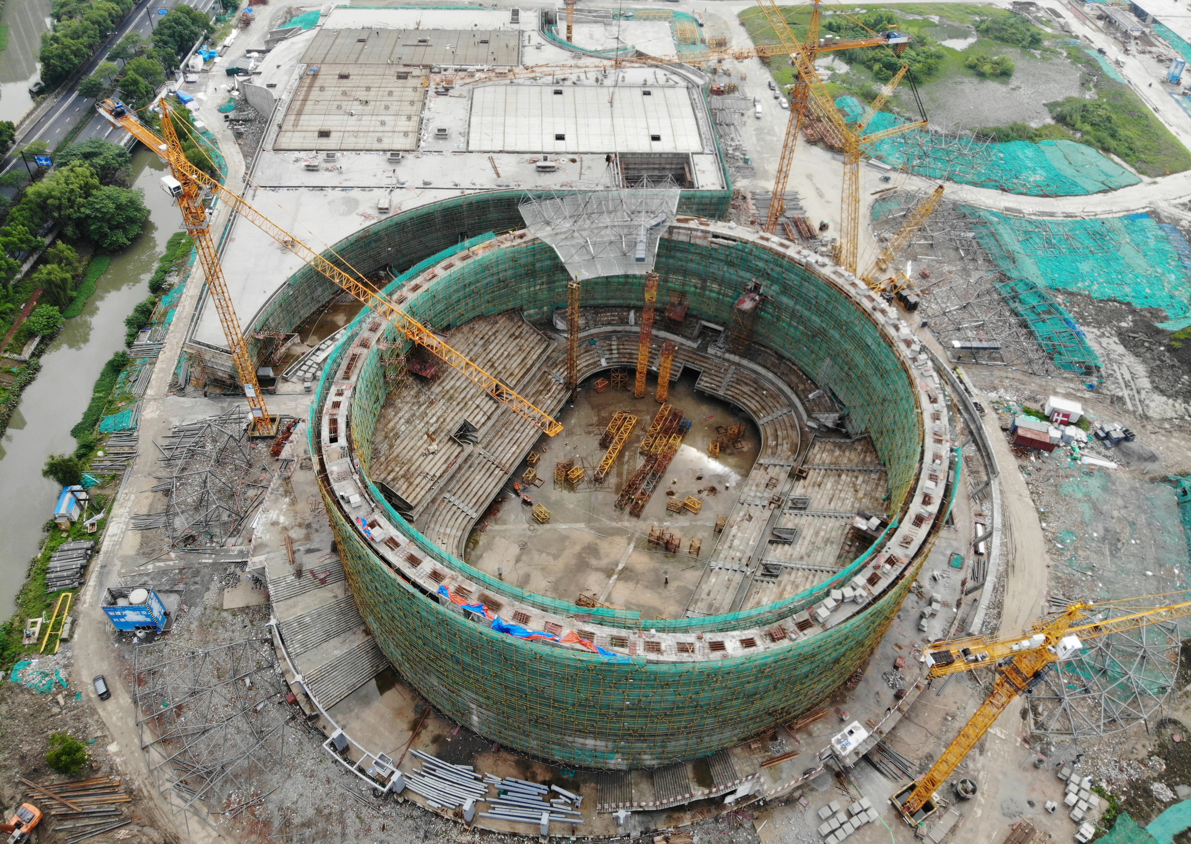 2020年6月9日,從空中俯瞰正在建設(shè)中的杭州亞運(yùn)會(huì)乒乓球館。近日,位于杭州運(yùn)河亞運(yùn)公園內(nèi)的乒乓球館主體結(jié)構(gòu)完工,開始進(jìn)入自支撐鋼斜肋系統(tǒng)玻璃立面安裝階段。據(jù)了解,杭州亞運(yùn)會(huì)乒乓球館占地1.94萬平方米,將建成12片標(biāo)準(zhǔn)乒乓球場(chǎng)地,并可容納5000-6500位觀眾。該乒乓球館設(shè)計(jì)靈感來源于杭州良渚文化中的“玉文化”,采用了“琮”的樣子。