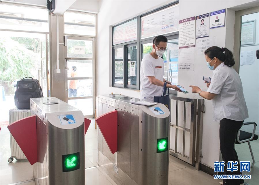 6月8日,在武漢大學(xué),返校學(xué)生掃健康碼以及測(cè)體溫后進(jìn)入宿舍。6月8日起,武漢大學(xué)、華中科技大學(xué)、武漢理工大學(xué)、華中師范大學(xué)等多所武漢高校迎來首批返校畢業(yè)生。新華社記者肖藝九攝