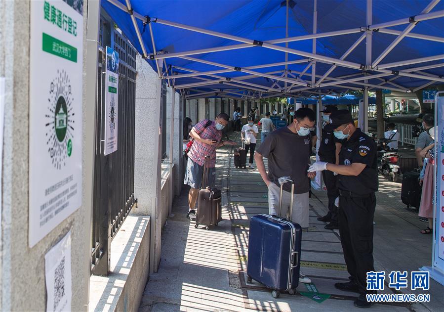 6月8日,在武漢大學(xué)西門,返校學(xué)生掃健康碼進(jìn)入校園。6月8日起,武漢大學(xué)、華中科技大學(xué)、武漢理工大學(xué)、華中師范大學(xué)等多所武漢高校迎來首批返校畢業(yè)生。新華社記者肖藝九攝