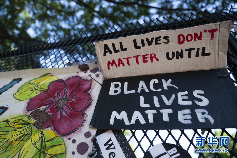 6月8日,美國華盛頓白宮附近的隔離圍欄上貼著抗議標(biāo)語。新華社記者劉杰攝